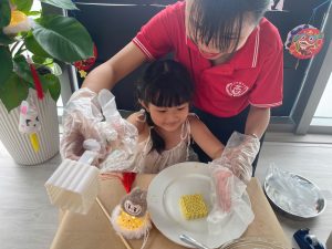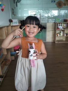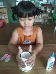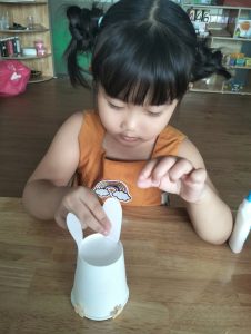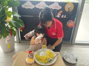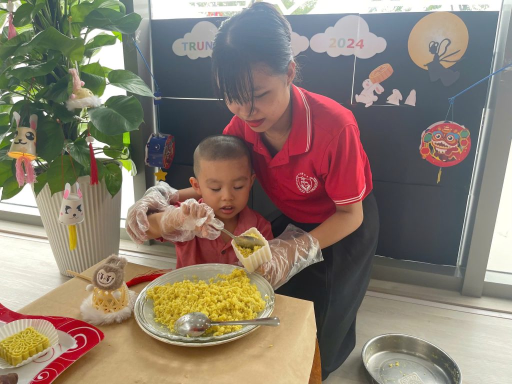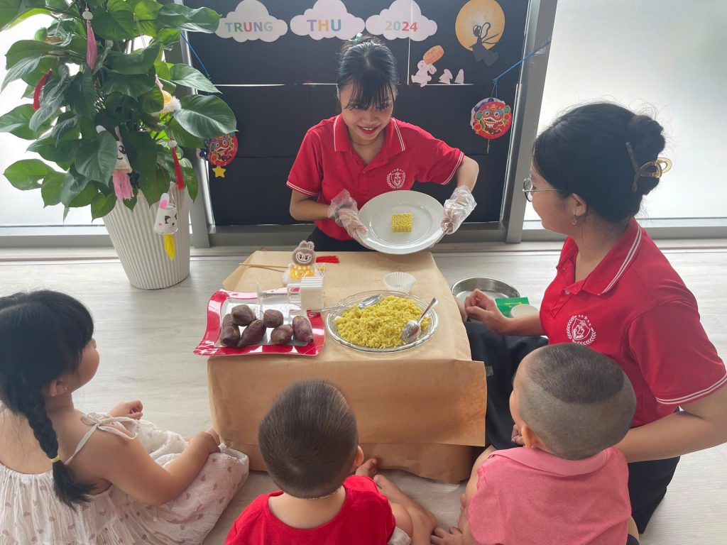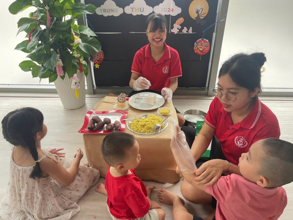 Tại TB , các bạn nhỏ cùng các cô tạo ra những chiếc lồng đèn xinh xắn từ giấy và que kem; từ kỹ năng in màu, cắt và dán. Với bàn tay khéo léo của các bạn nhỏ đã tạo ra những chiếc lồng đèn xinh xắn. Trung thu, đã có lồng đèn, cần có thêm bánh trung thu nữa! 10 phút hí hoáy, cô và các bạn nhỏ đã có những chiếc bánh trung thu đẹp mắt từ khoai lang.